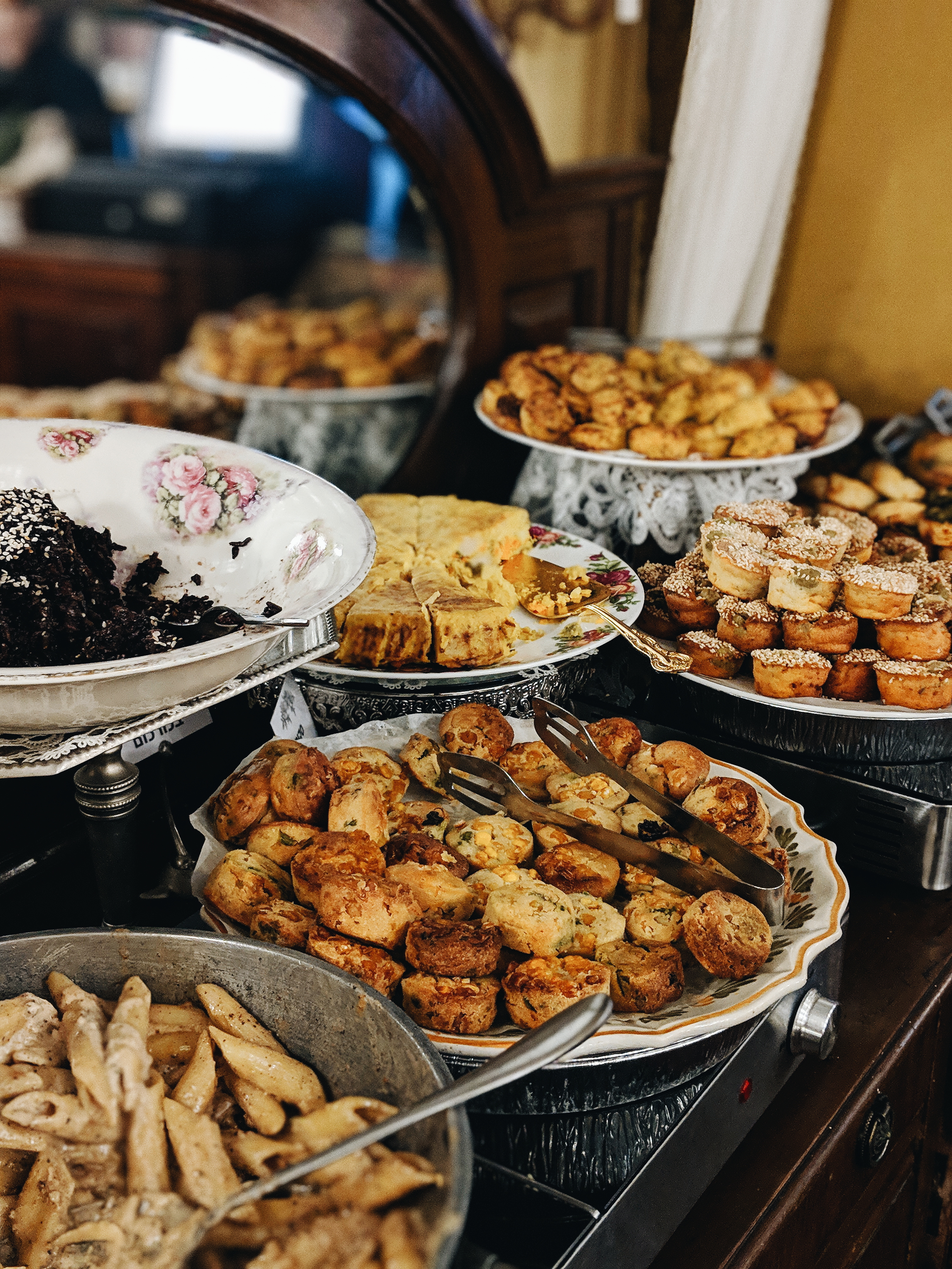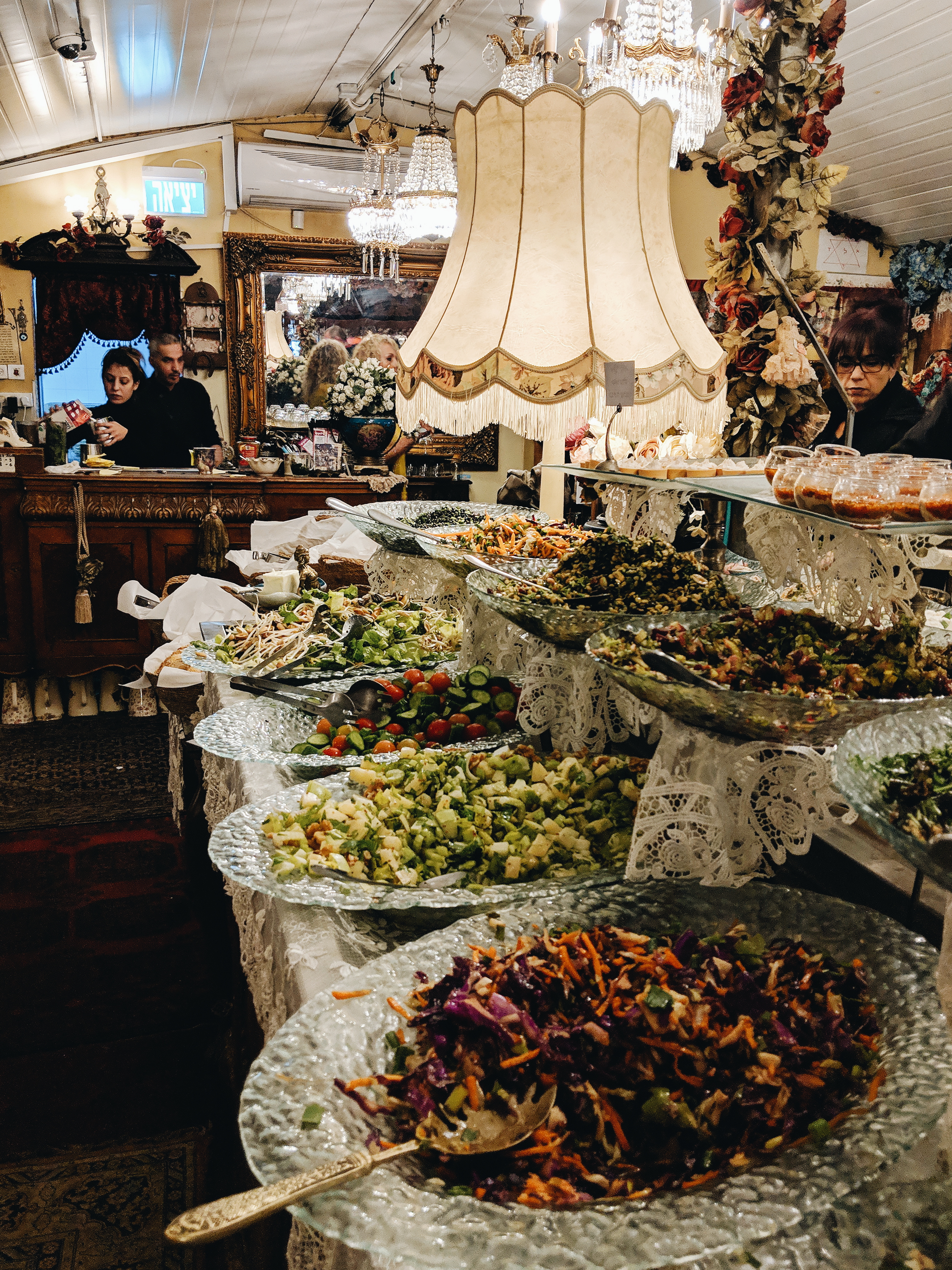 The restaurant offers a daily breakfast and lunch Buffet, served between 9:00 to 15:00. There a lot of options for vegetarians, as it is a dairy menu, and there are also disehs for vegans. The buffet offers a large variety of salads, quiches, pastries, vegetables, and desserts.