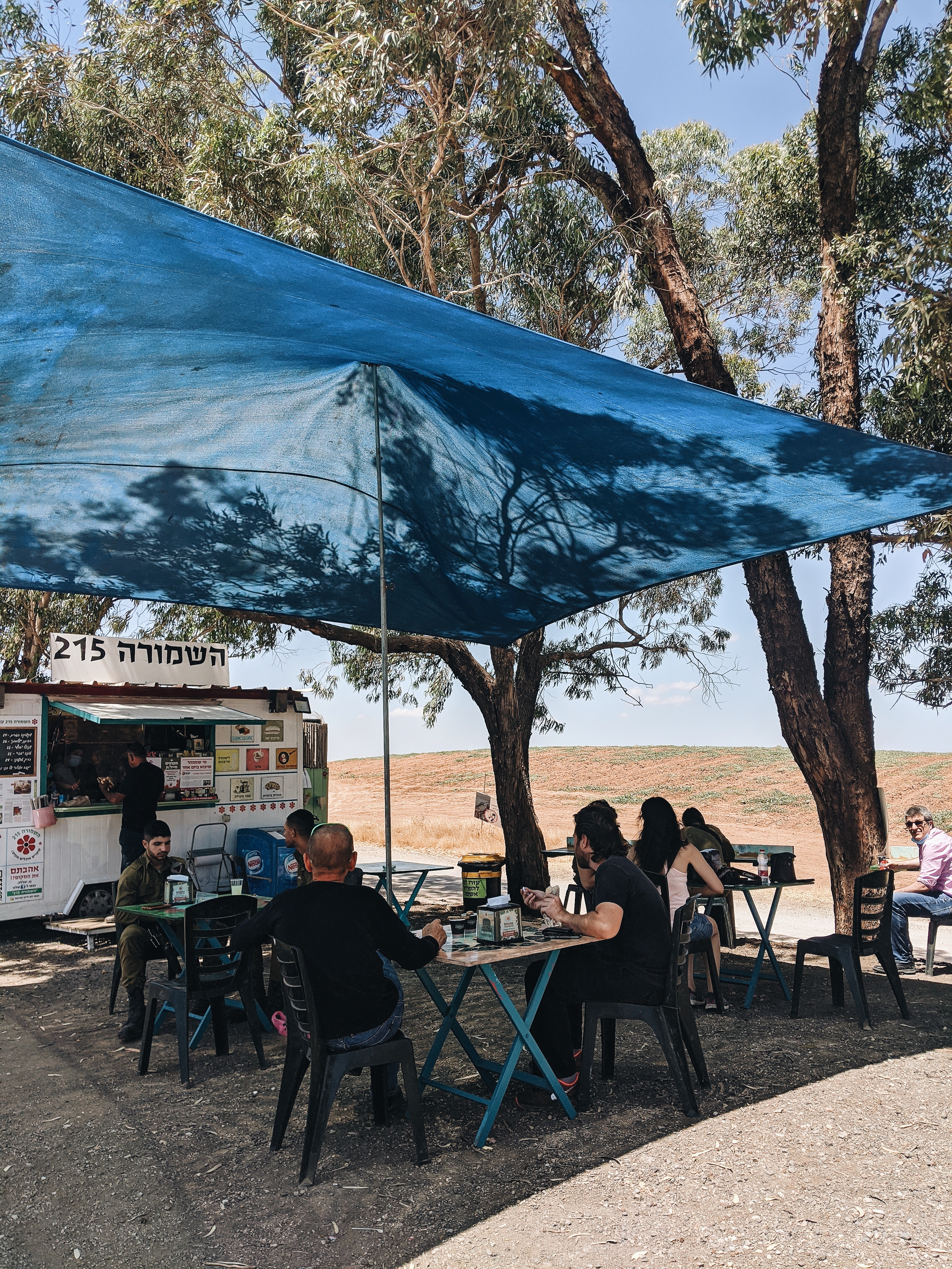 היעד די רחוק, נסיעה של שעתיים וארבעים וחמש דקות, אז היינו חייבות לעצור בדרך לאכול ולהתרענן. החלטנו לעצור במקום שנקרא ״השמורה 215״, מעין פוד טראק קבוע בכניסה לשמורת פורה – בדיוק בדרך. מקום ממש חמוד עם הרבה מקומות ישיבה ונוף של שדות מהממים. והכי חשוב, הזמנו כריך שקשוקה והוא היה פשוט טעים ברמות, עשיר וממלא.