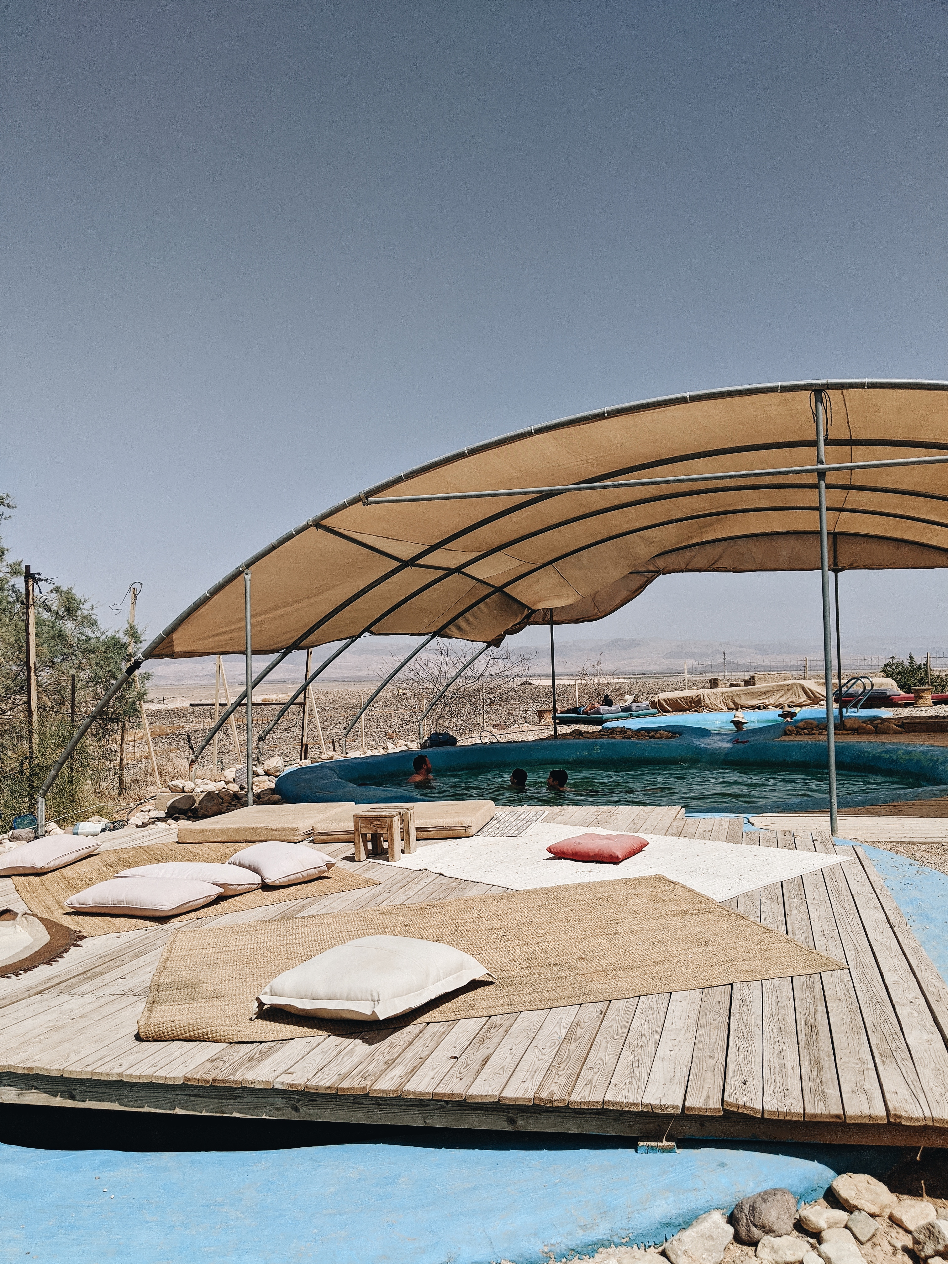 לאחר נסיעה ארוכה הגענו ליעד הנכסף. באמצע המדבר מגיעים לחניון קטן (ללא תשלום) שממנו יש כניסות למספר מתחמי צימרים. התקשרנו להודיע שהגענו ונהג עם רכב גולף הגיע לאסוף אותנו ולקח אותנו ישירות לבקתה. הבקתה שלנו היתה מרוחקת ומבודדת יחסית אז בדרך עברנו בין כל המתחם המקסים והפשוט (במובן החיובי) שכלל בריכת שחייה ואזור זולה גדול עם המון מקומות ישיבה ומטבח ענק לשימוש האורחים. כל המתחם הוא אקולוגי וידידותי לסביבה והבקתות בנויות מחבילות חציר ולבני בוץ.