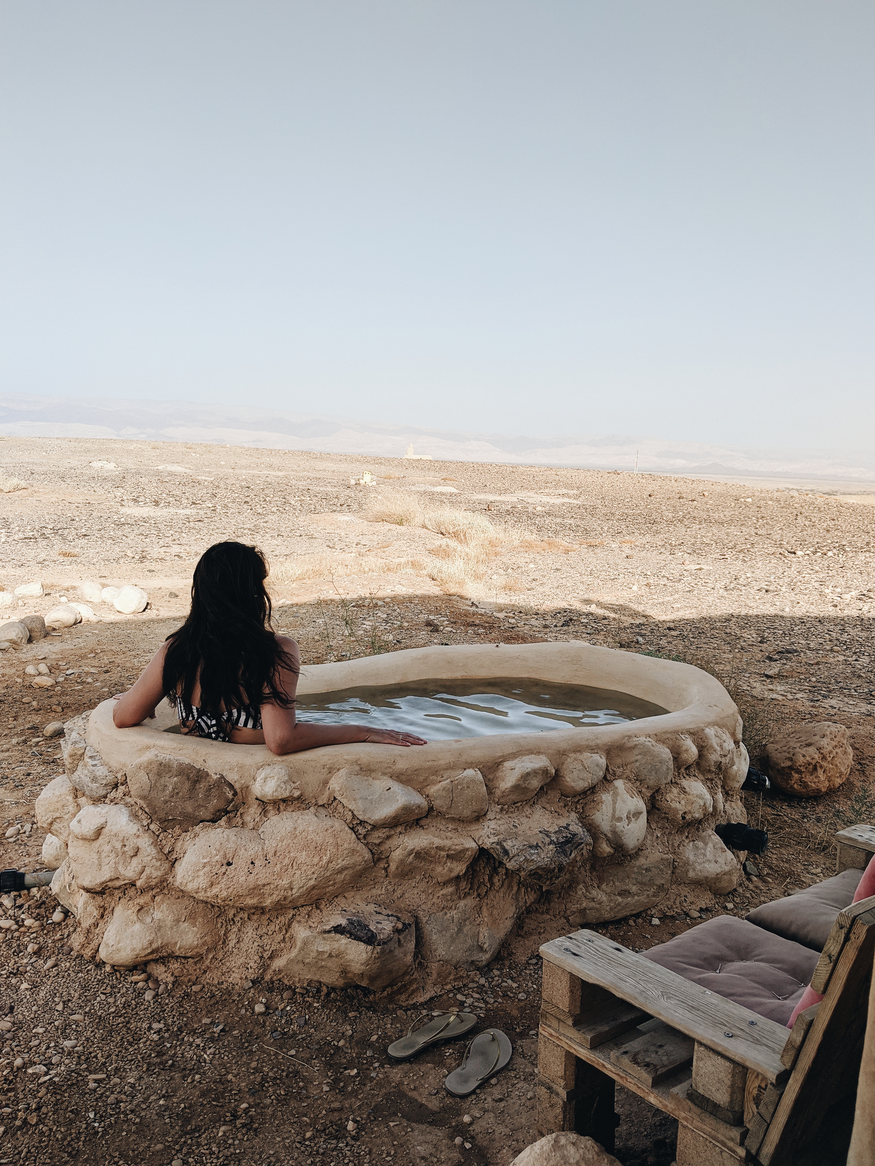 אנחנו קיבלנו את בקתת ״שרה״ המההמת (אחת מבקתות הקצה). הבקתה כללה סלון מרווח, מיטה זוגית, מקלחת ושירותים, מטבח חיצוני מאובזר עם מקרר, שולחן אוכל חיצוני, ערסל, אמבט חיצוני מפנק ועמדת מדורה מצויידת בעצים (וכמובן מזגן וקמין עצים להתחמם בחורף). והכל אל מול הנוף הבתולי והפתוח של המדבר.