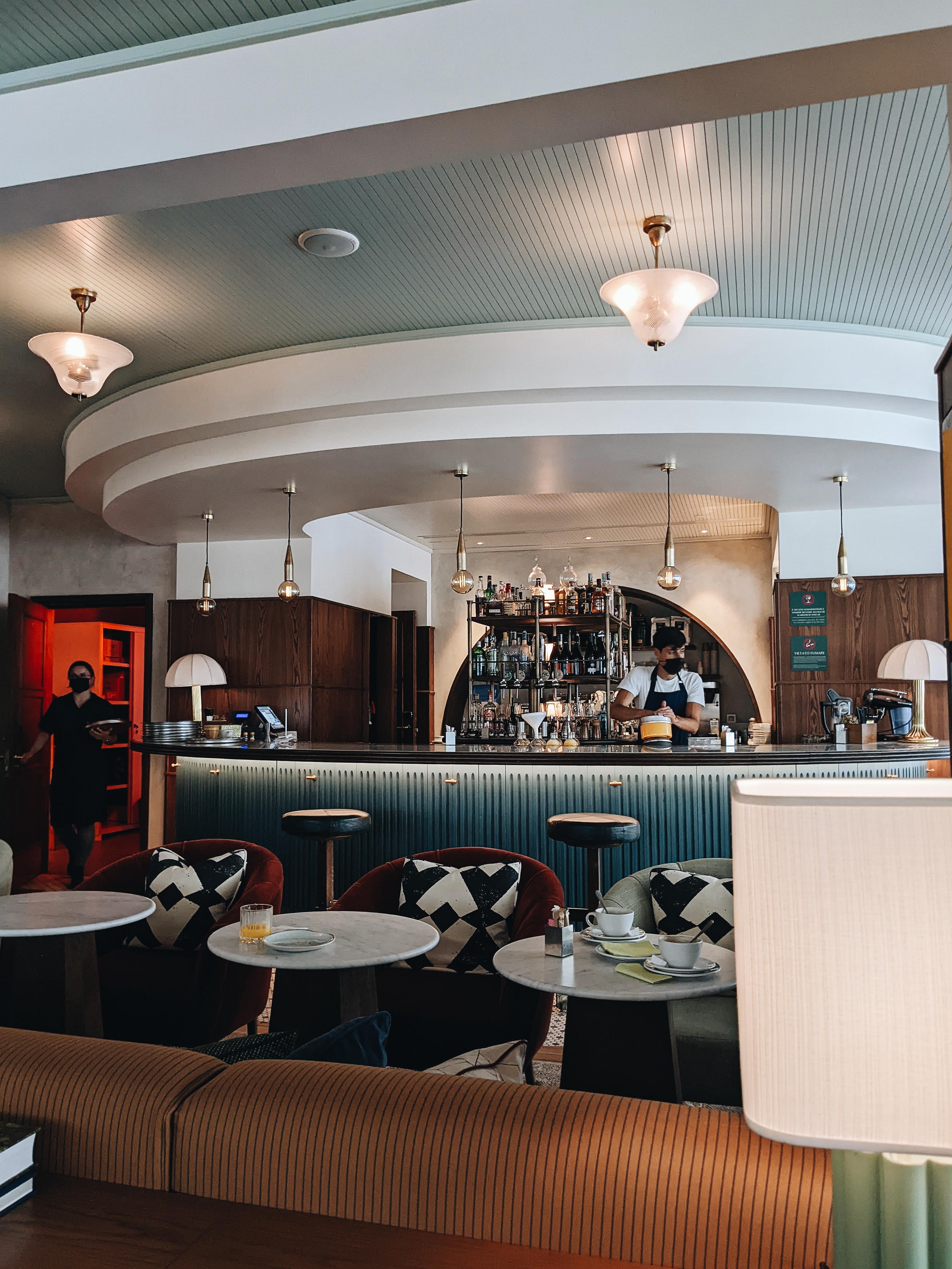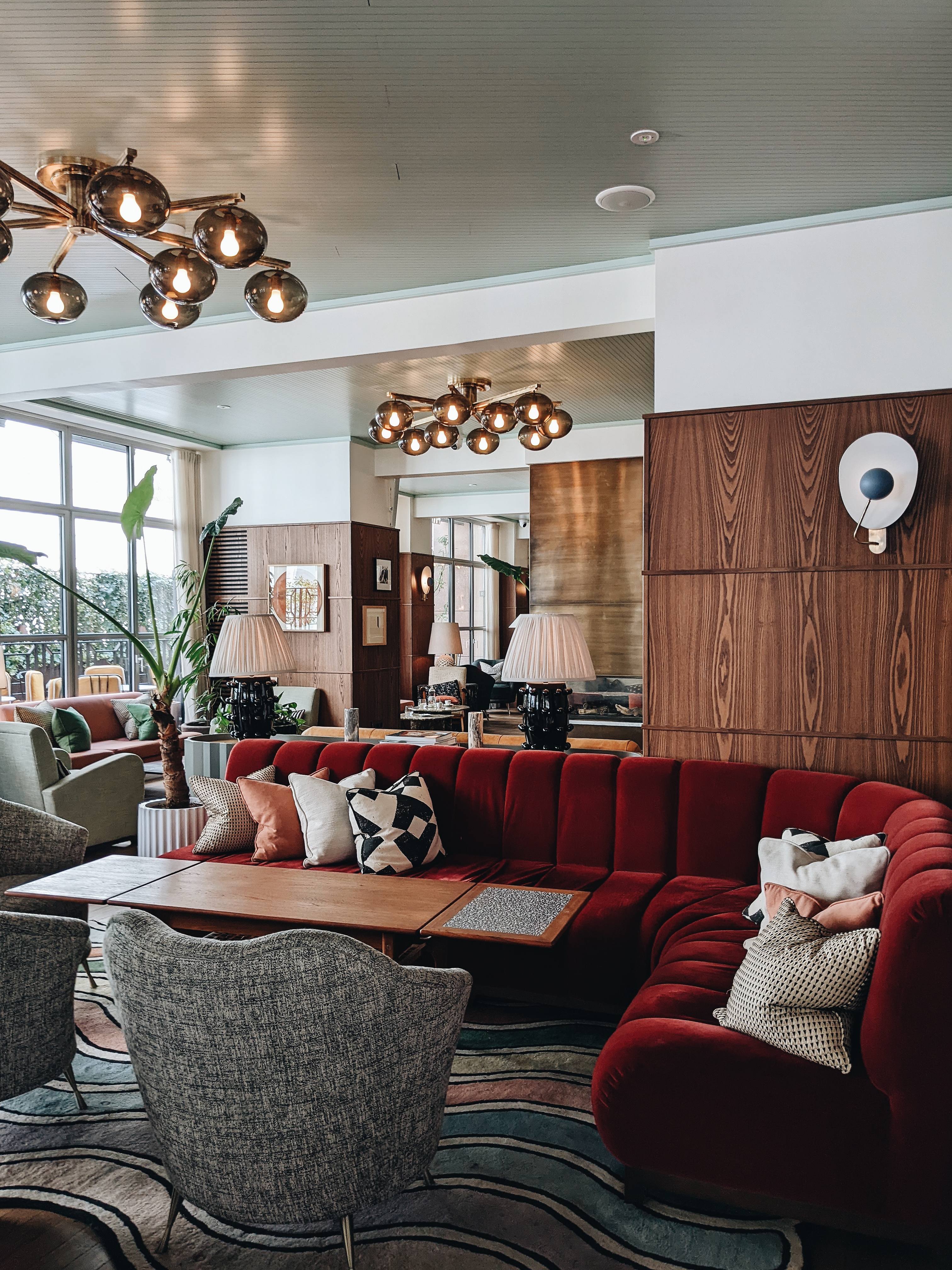The hotel is designed in an eclectic style, classical yet modern, with mid-century-inspired furniture. There are a lot of couches and seating areas in the lobby, which is wide and inviting.
